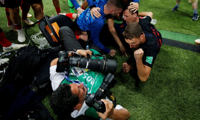 Dê a sua proximidade ao campo de jogo, talvez seja uma surpresa que isso não ocorra com mais frequência. Mas quando um fotógrafo da Copa do Mundo se viu no fundo de uma pilha de croatas durante a semifinal da Copa do Mundo contra a Inglaterra, ele se aproximou da ação do que ele poderia imaginar.